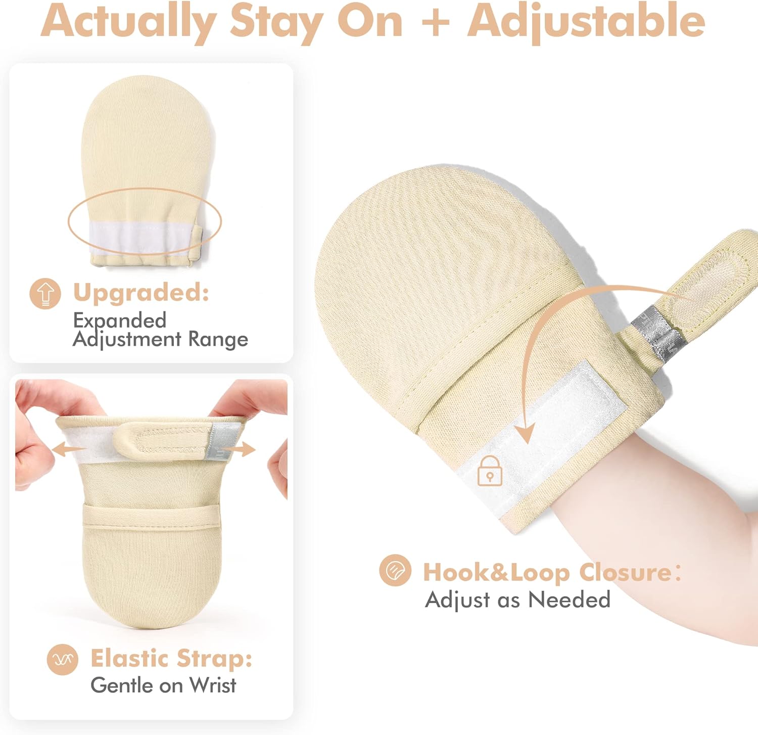 HAPIU Baby No Scratch Mittens Stay On, 100% Cotton Breathable, Adjustable Infant Gloves for Boys Girls, Newborn - 12 M