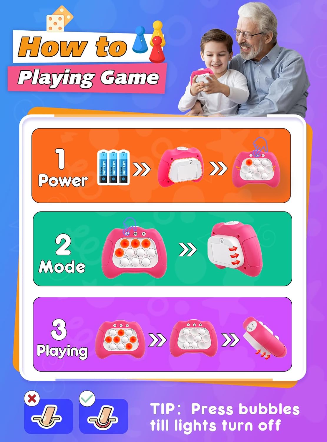 - Entertained but Educational: This bubble-up fidget toy upgrades the early older simple bubble toys with innovative LED lights and game audio. Just press the lighting bubbles fast. Kids will easily play with the push up puzzle game controller and get fun, while sensory, focus and concentration, hand-eye coordination, and brain memory will be trained and developed during the speed challenge.