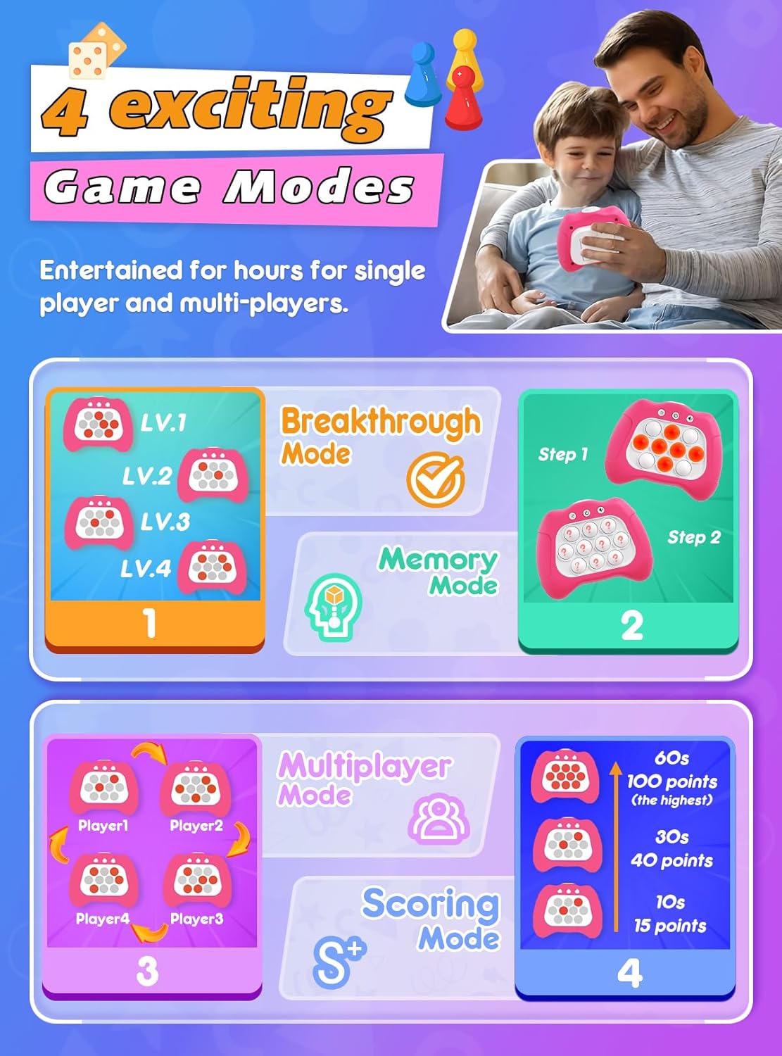 - 4 Modes Game: The quick push machine contains 4 interactive games, they are level-breaking mode memory mode, scoring mode, and multiplayer mode. Each mode has different difficulty levels, multiplayer mode is a great pk game. Definitely suited for kids and adults, this novelty fidget game can play a role on car rides, airplane trips, family gatherings, and party nights. Road trip must haves for teens, the children could be occupied with travel activities for hours; the party never boring anymore.