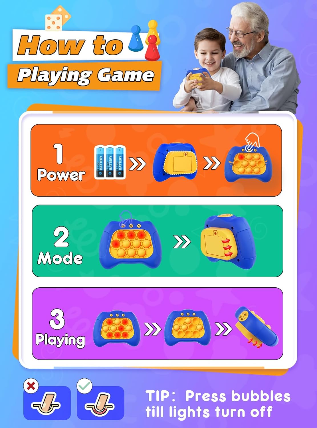 - Entertained but Educational: Upgrades the early older simple bubble toys, our bubble-up fidget toy adds innovative LED lights and game audio. Just press the lighting bubbles fast. Kids will easily play with the push up puzzle game controller and get fun, while sensory, focus and concentration, hand-eye coordination, and brain memory will be trained and developed during the speed challenge.