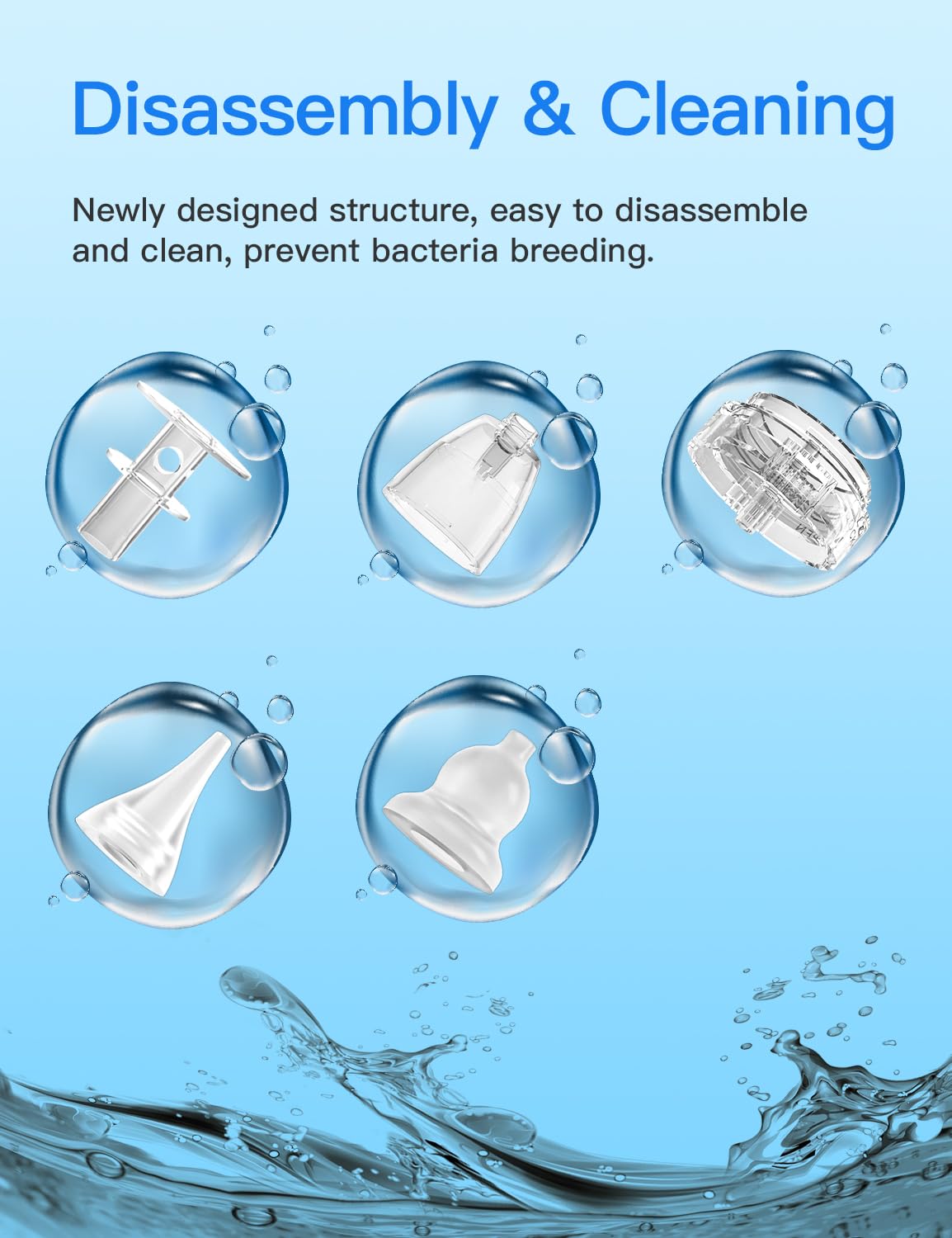 - Durability Tips: The inside of the machine is not waterproof. When cleaning, just take out the storage box and silicone suction head for cleaning. Be careful of water intrusion. Please clean it in time after use to avoid nasal mucus being sucked into the machine. The battery is easily damaged if not used for a long time. It is recommended to start it regularly to extend the service life of the nasal aspirator.