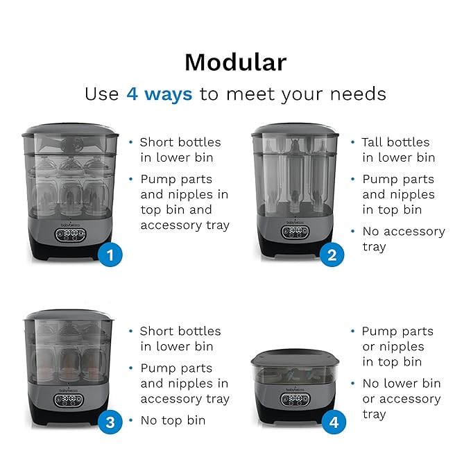 - MOST MODULAR 3-LAYER DESIGN: Use 4 different ways to meet your needs – Only Sterilizer Dryer with large lower bin, shorter upper bin and unique accessory tray; More convenient and easier to use than microwave sterilizer bags or UV sanitizers