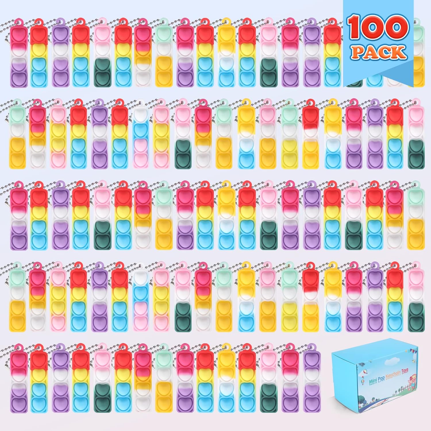 - ❤【New Exterior Design】Our new mini pop toys give deeper meaning to gift-giving with a love theme.It includes 100 pcs of mini keychains with different colors inside.The fidget toys made with a new design appearance,novelty style,fashionable and cute.The use of hanging hole design,more convenient to carry.You can hang the chain on your keys,backpack,pencil case,cell phone,or even on birthday cards,thank you cards,Valentine's Day,Easter,New Year's cards,Christmas cards.