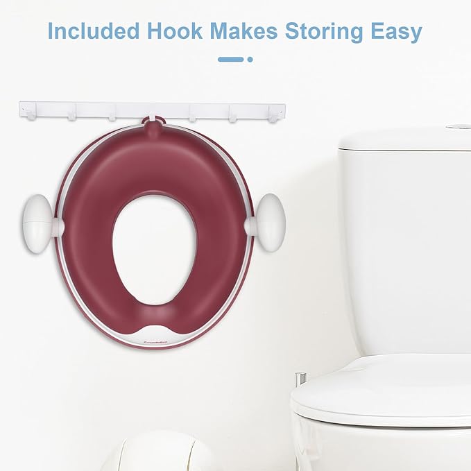- Ergonomic Design - Streamlined high-back design fits the baby's back, ergonomic design protect your baby's spine from damage. Also, anti-splash design of the training seat prevents spills outside the toilet. Self-contained hook design for easy storage, detachable high quality cushion makes cleaning easy.
