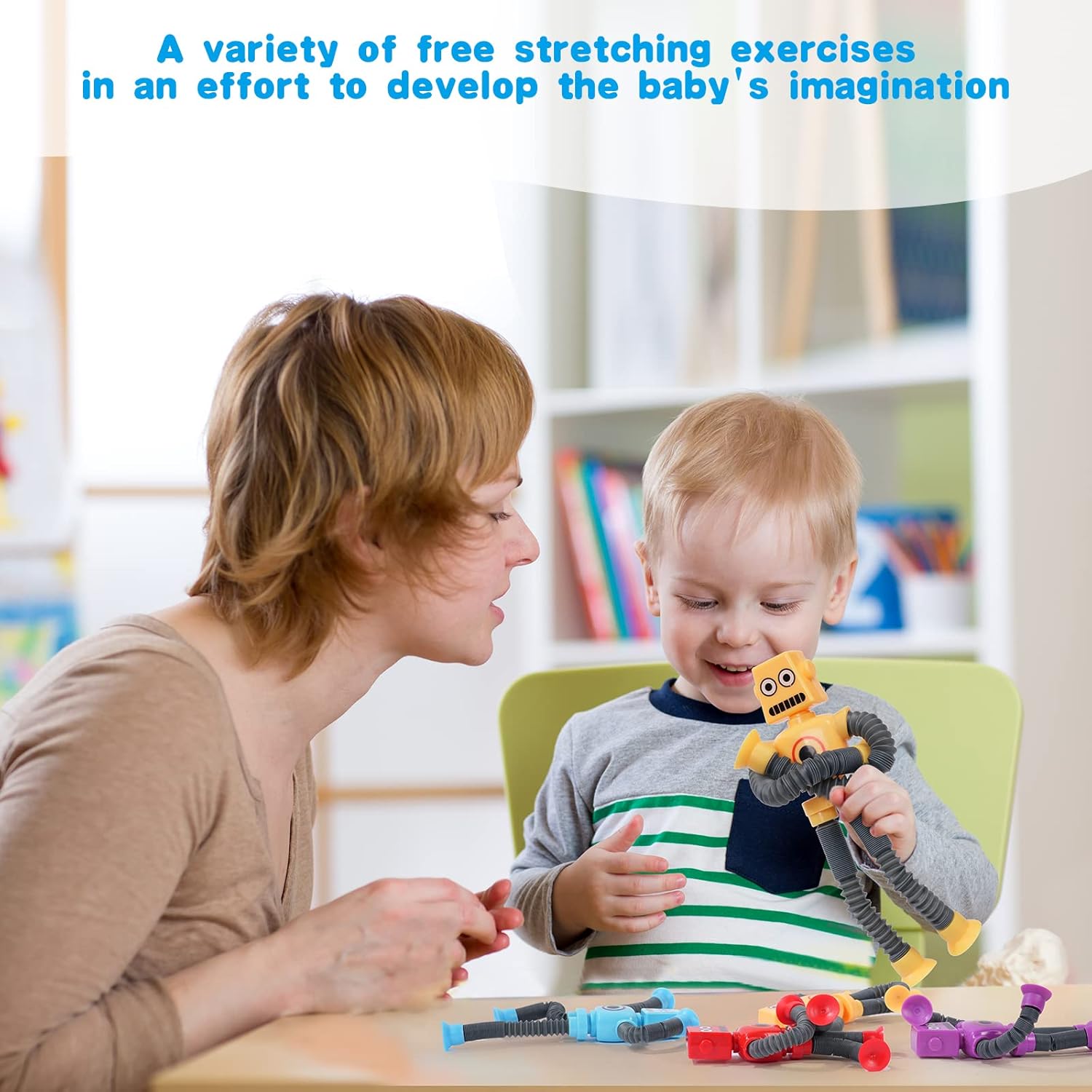 - 🤖【CREATIVE DESIGN】The telescopic suction cup robot toy is a fun and innovative sensory toy, which consists of stretchable and rotating tubes. one end of the tube is connected with a cool robot body, and one end is designed with a suction cup, which can be stretched and twisted into different shape and fixed.Its unique design engages children in imaginative play and helps develop their fine motor skills.