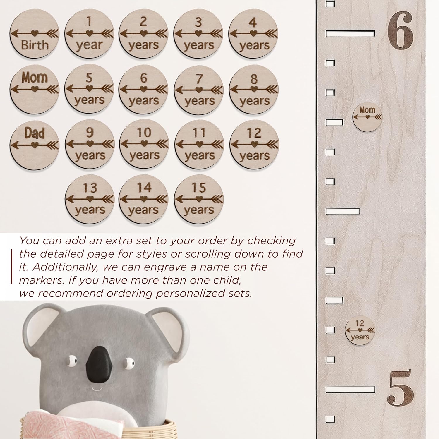 - Set of growth markers: these markers can be attached to a wooden kids' measuring chart using double-sided stickers to serve as growth marks, you can add an extra set to your order by scrolling down the product detail page, additionally, if you order an extra set, it can be engraved with a name, if you have more than one child, we recommend ordering personalized sets for each