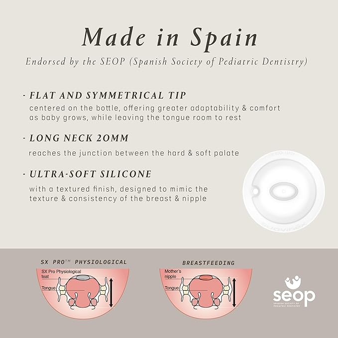 - 100% silicone SX Pro Physiological nipple with anti-colic valve is designed to help the tongue remain in the same natural position as when baby is breast-feeding, aiding in correct positioning of the mouth, tongue & jaw.