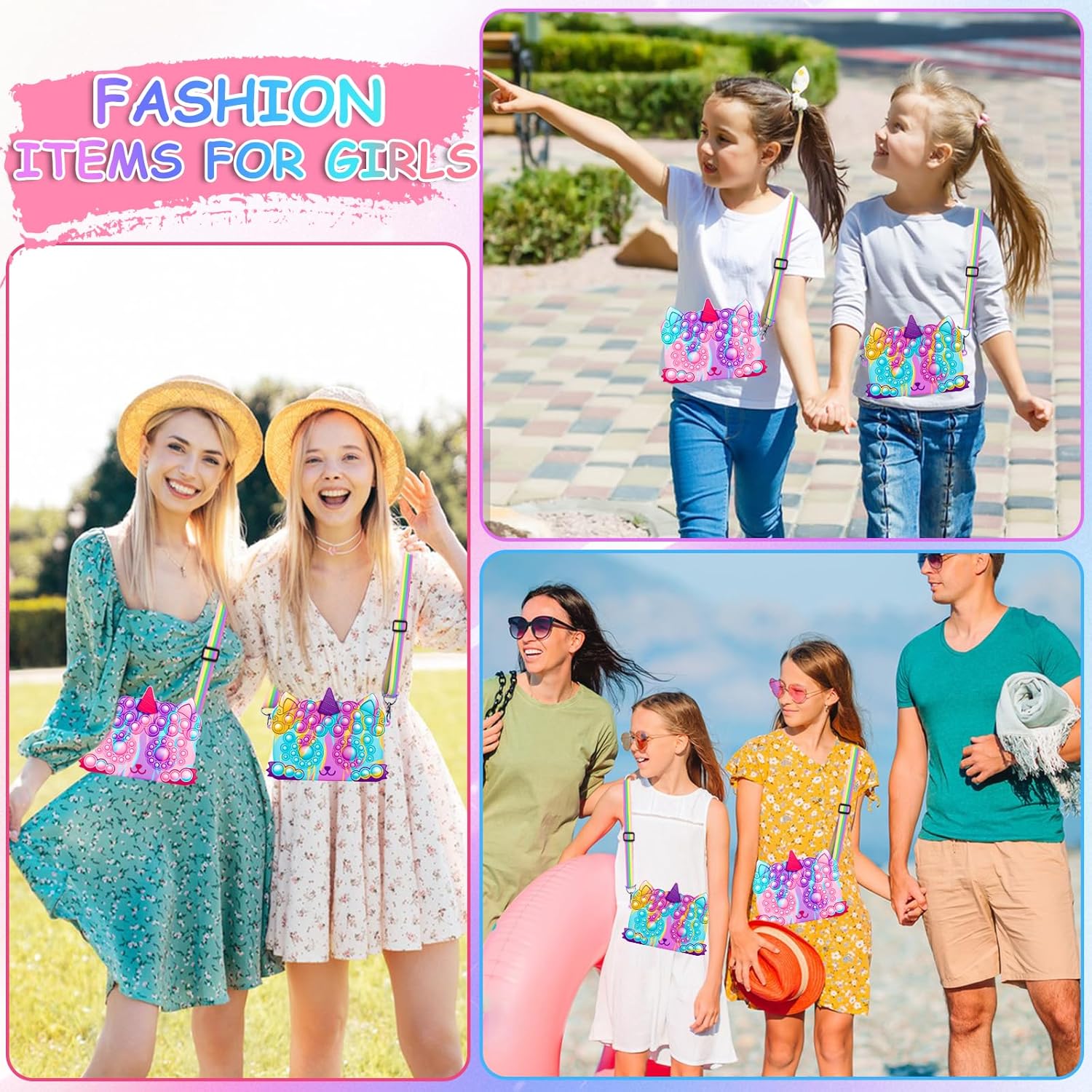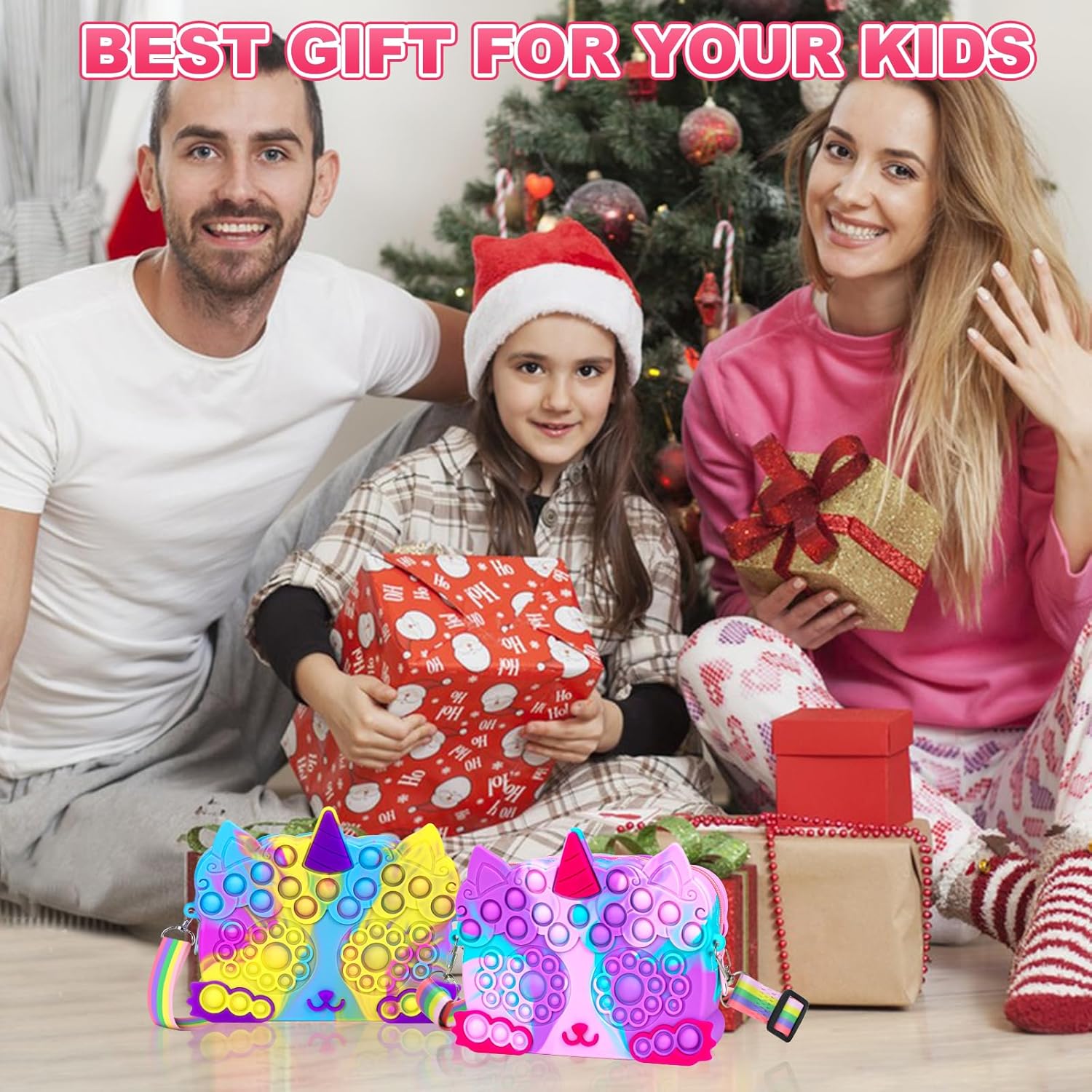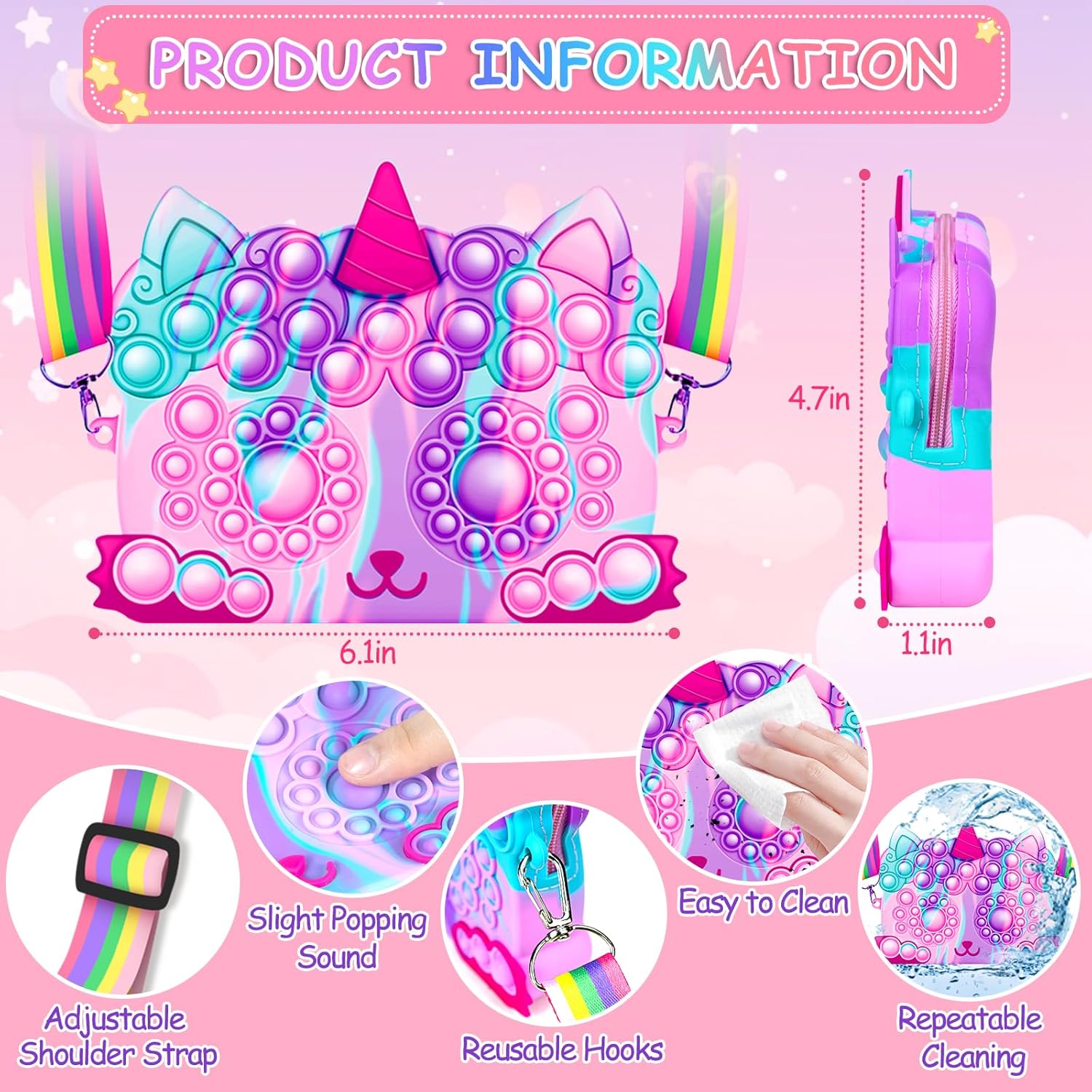 - Great Sensory Fidget Toys: 2 Pack Unicorn Purse Pets- A push bubble fidget toy, A purse wallet and A shoulder bag (3 in 1). Pressing the bubbles on the bag will make "POP" sound which is attractive. The push bubble shoulder bag is the most popular designed for stylish girls and kids. Suitable for girls of all ages.