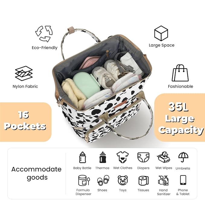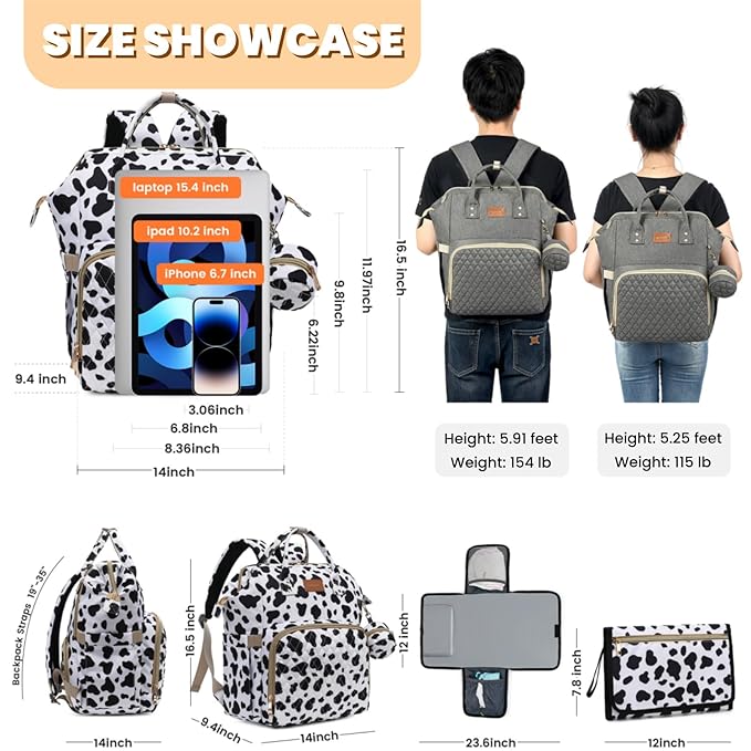 Diaper Bag Backpack with Changing Pad, Pacifier Case, Baby Bag for Boy Girl Toddler - Large, Stylish, Waterproof Travel Quilted Diaper Bag for Mom - Baby Shower Registry - Cow