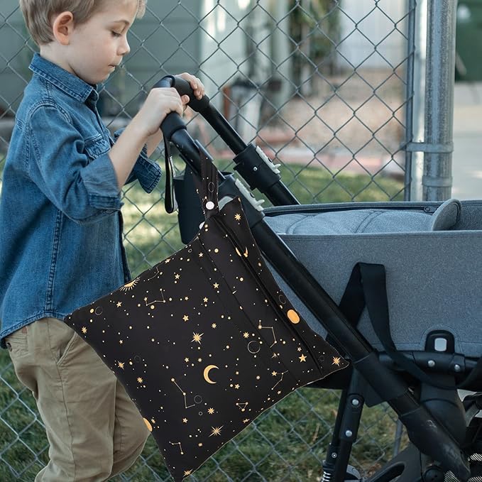 • 2 ZIPPERED POCKETS & HANDLE DESIGN: The 2 pack cloth diaper bags are designed with 2 Zippered compartments to keep wet and dry clothes separately, or separate dirty and clean diapers. There's a handle with a button on one side for hanging up, convenient to carry and attach to your stroller, doorknob, towel rack, hook or handbag.