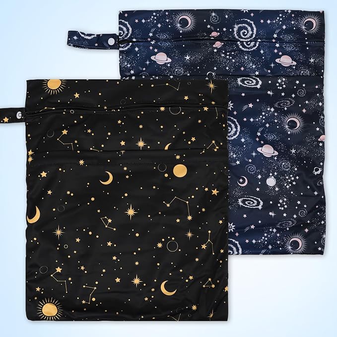 • 2 ZIPPERED POCKETS & HANDLE DESIGN: The 2 pack laundry bags are designed with 2 zippered compartments to keep wet and dry clothes separately, or separate dirty and clean diapers. Keep dry and clean. There's a handle with a button on one side for hanging up, convenient to carry and attach to your stroller, doorknob, towel rack, hook or handbag.