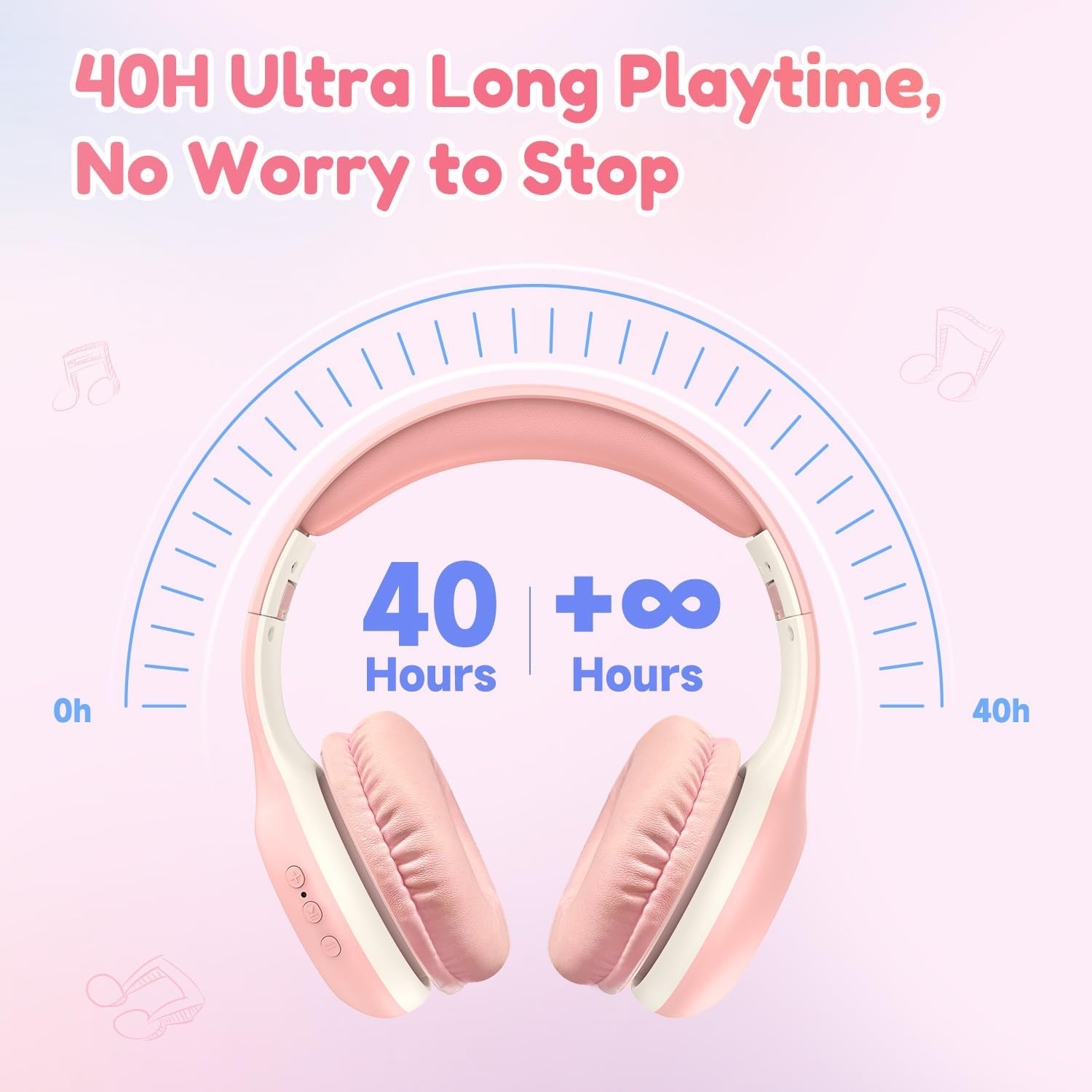 - 40H Playtime, All Day Use. The Bluetooth headphones can keep you enjoying the playtime time of music, study and calls all day with 40 hours of ultra-long battery life. Besides the kids headphones can provide extra playback by USB-C cable recharging 2.5H for the battery.