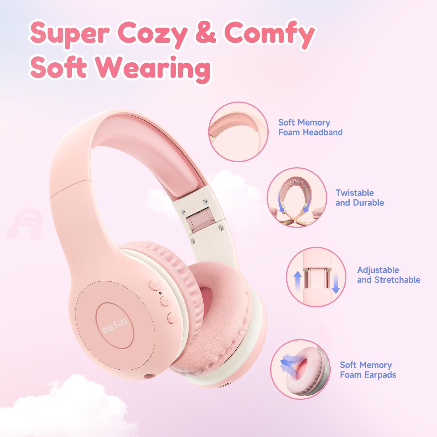 EarFun K2 Kids Bluetooth Headphones, Kids Headphones with Volume Limited, 40H Playtime, Built-in Mic, Stereo Sound, Foldable Over-Ear Headphone for School/Travel/iPad/Tablet, Pink