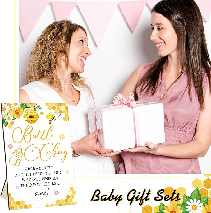 TrelaCo Cool Baby Shower Games Wooden Bottle Chug Sign Bee Theme Gift Sets and 12 Pcs Baby Bottle Shower Favor for Honeycomb Bee Games Gender Reveal
