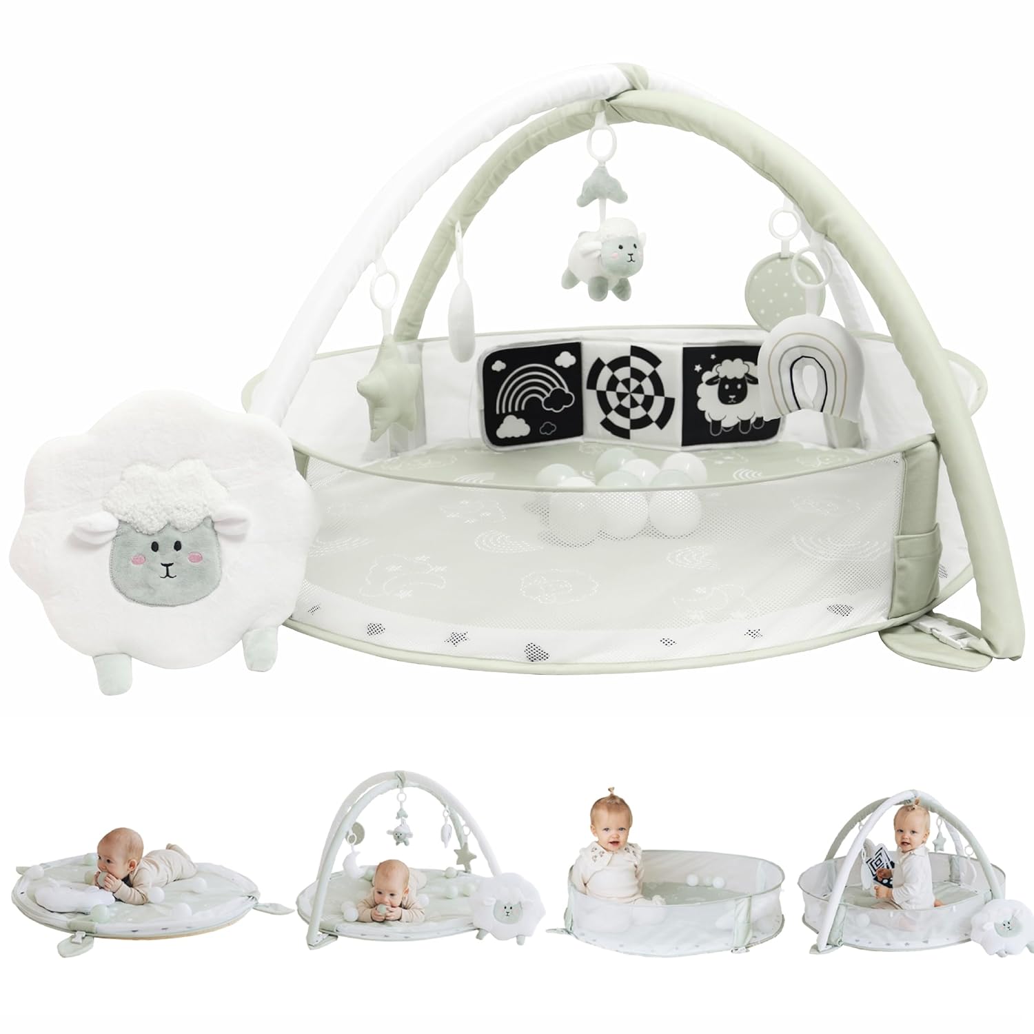 - 👼 {Adaptable} This versatile baby playmat encompasses 6 different uses: tummy time mat, baby activity center, pop up mesh fence, high contrast book, ball pit with balls included and lamb storage bag. Engineered to align with your baby's developmental stages, this mat will capture your baby's attention providing hours of both entertainment and learning. Caution: Always ensure adult supervision during use.