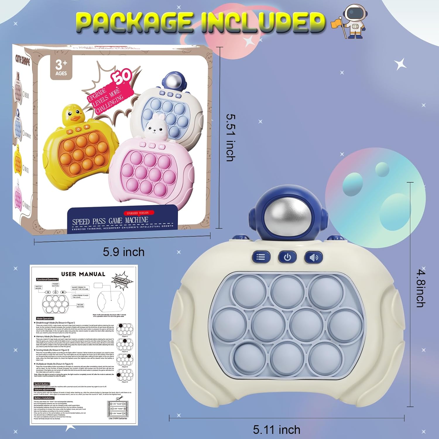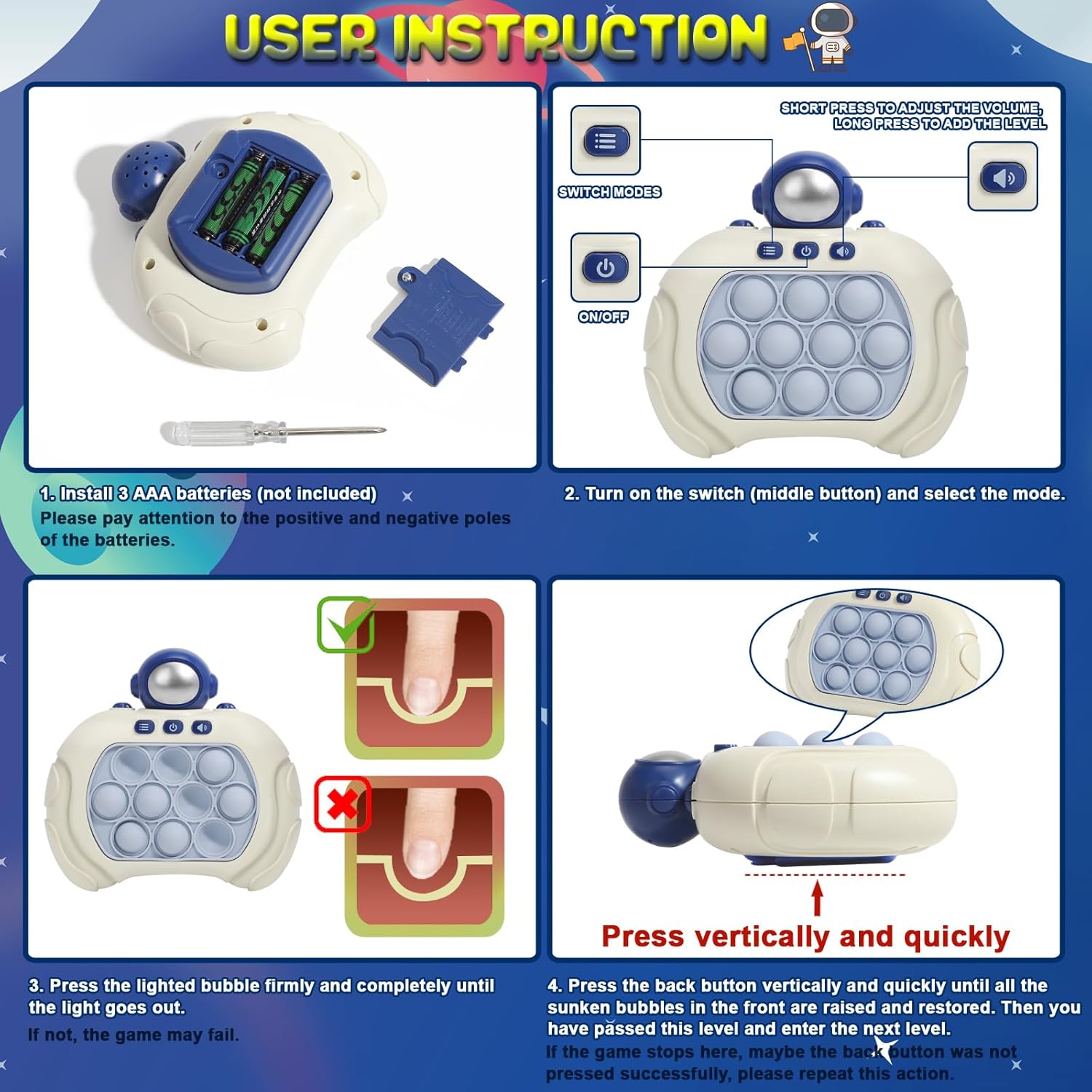 Quick Push Pop Game Fidget Toys for Kids Adults, Handheld Puzzle Game Machine, Squeeze Poppet Sensory Fast Push Bubble Toy, Xmas Birthday Gifts for Boys Girls (Astronaut Green Light)