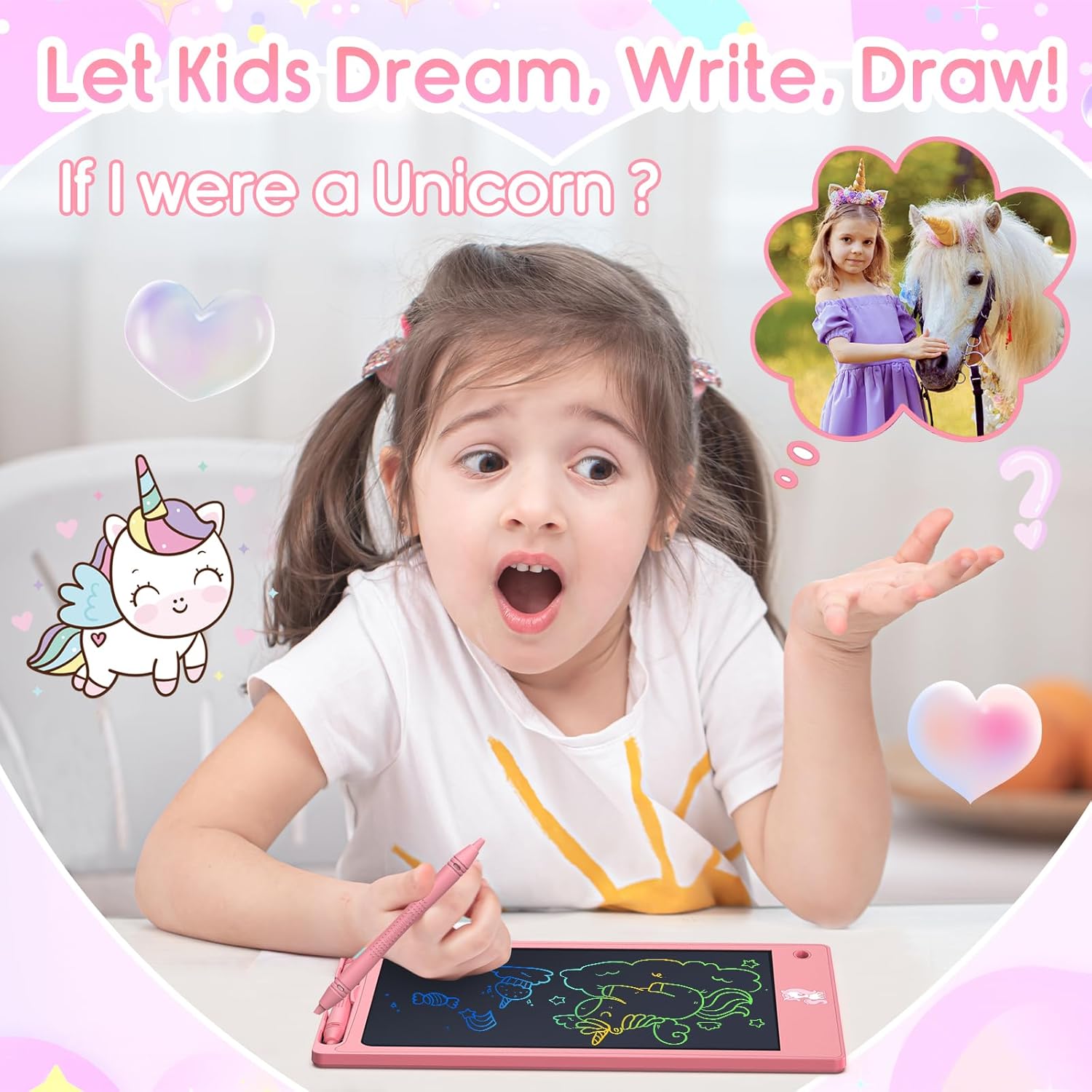 - [Upgraded Colorful Drawing Pad, Unique Design with Cute Unicorn]: Apply the newest flexible liquid crystal technology, brighter and clearer than most LCD writing tablet. Take pressure-sensitive technology, you can draw lines of different thicknesses through different pressure levels. Package includes 1 pack LCD writing tablets, 1 stylus pen, 1 string. Each unit come with well-made package box for gift giving. If you have twins, multi-kids, it's a great choice to buy several at one time.