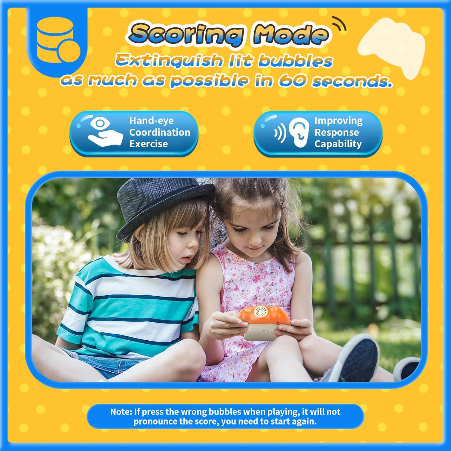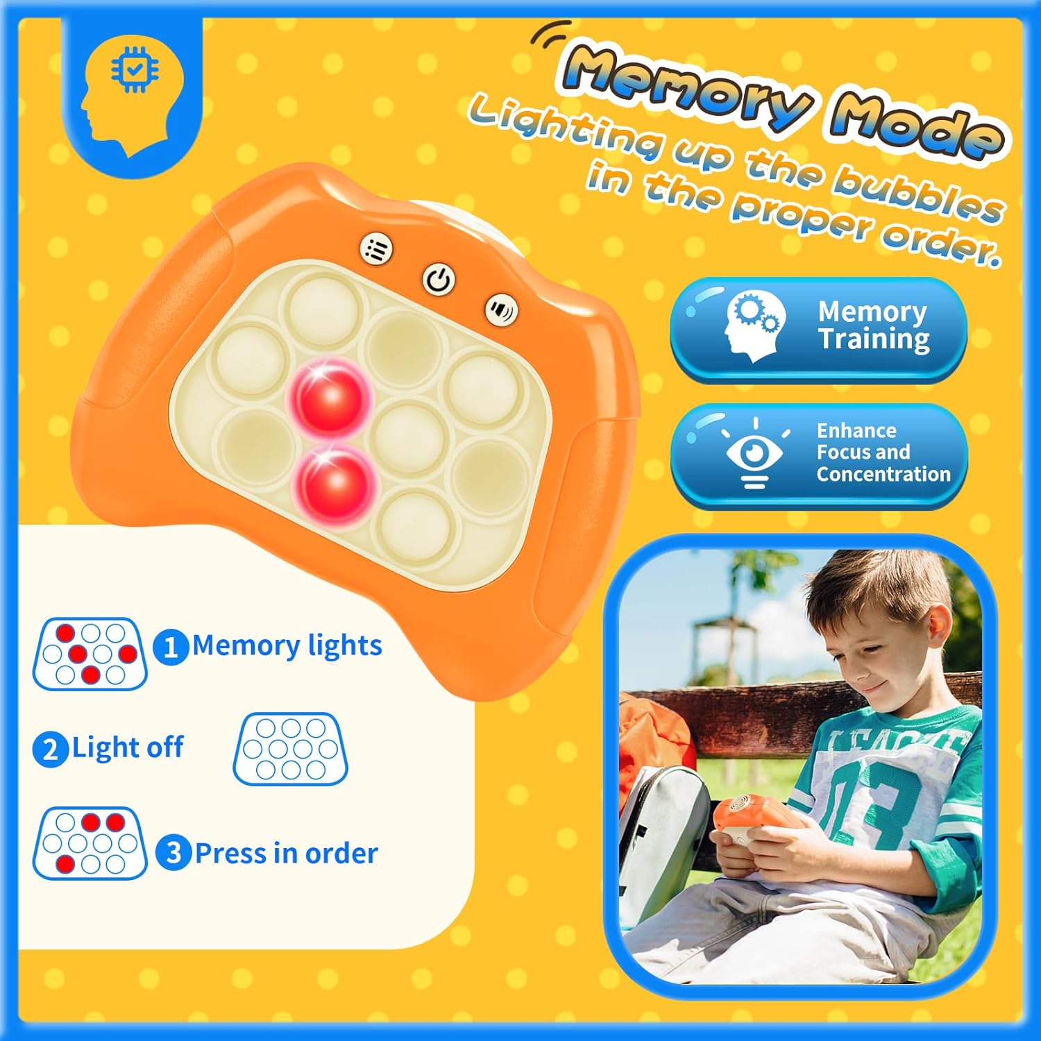 - LIGHT-UP POP FIDGET TOY: Classic pop game meets electronic handheld game! Our newly released quick push bubble game can promote kids sensory development, and engage their positive thinking, hand-eye coordination, and brain training during playing