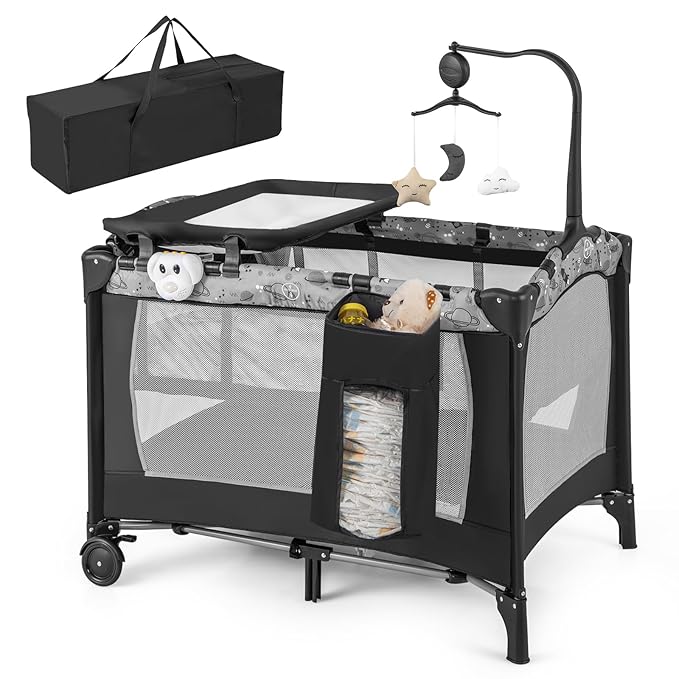 HONEY JOY Pack and Play, 4 in 1 Portable Baby Playard with Bassinet, Changing Table, Lockable Wheels, Music Box, Foldable Travel Baby Crib Nursery Center from Newborn to Toddler (Dark)