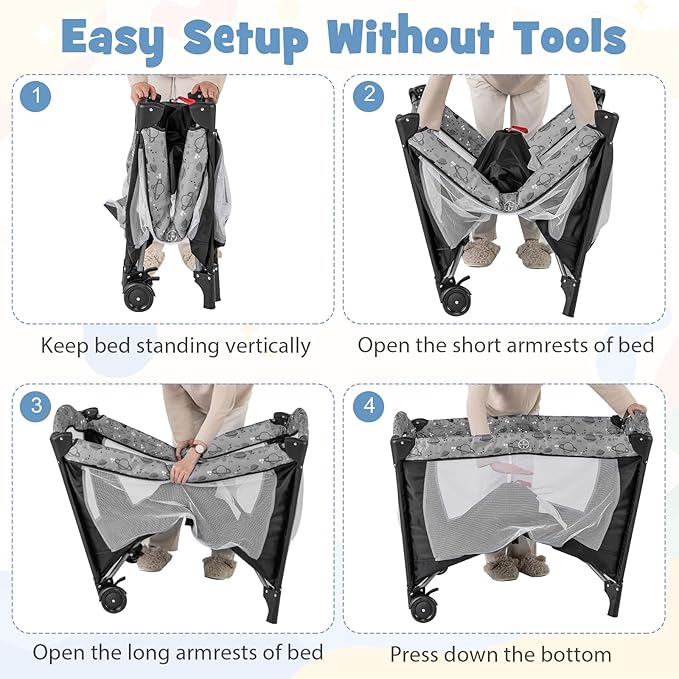 - 1.【Foldable & Portable Baby Playard】: This pack and play can be easily folded and then packed into a bonus Oxford carry bag for outdoor use. Even while traveling, your baby will have a comfortable area or play area. This baby playard with bassinet has lockable wheels so parents can move the bag freely around the living room.