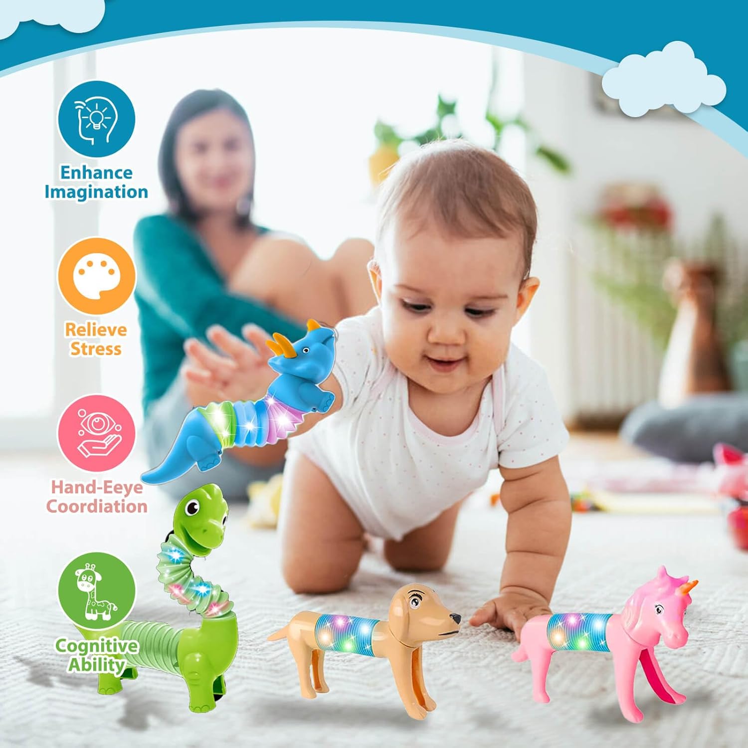 - Fun Pop Tubes Set: The sensory tubes for toddlers come in a 10-pcs pack with a large variety of animal shapes that can be stretched and reshaped with a crisp sound when stretched,perfect to keep children entertained and stimulate their creativity