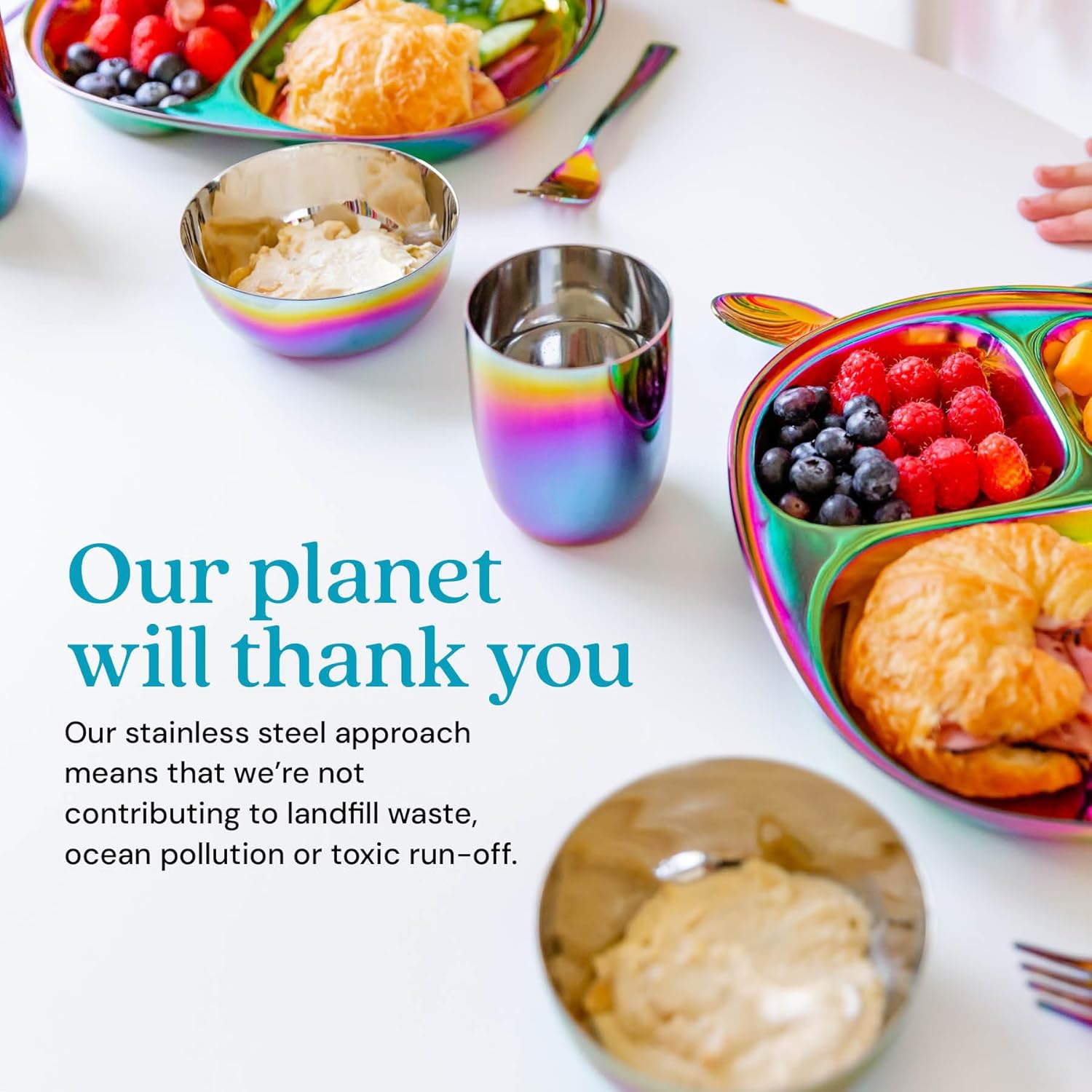 - Kid Approved — Ahimsa Mindful Mealtime Sets make mealtime fun with vibrant and colorful stainless steel kids plates that children adore. Included is a stainless steel toddler plate with dividers, a 8 oz. kids stainless steel cup and small baby bowl, and kids silverware (1 kid fork, 1 kid spoon).