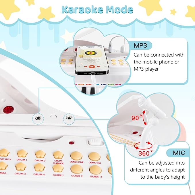 - Karaoke Mode with USB Cable: The microphone enables kids to practice singing while playing the piano. The MP3 interface can be connected with the mobile phone, iPad, computer or MP3 player. Meanwhile, the MIC interface connects to the microphage that can be adjusted into different angles to adapt to the baby's height.