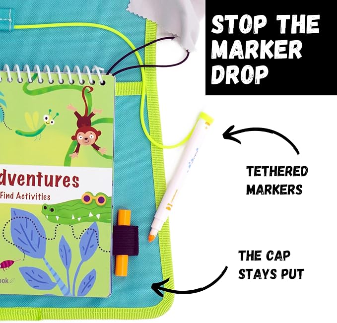 - CAR OR AIRPLANE ACTIVITIES FOR KIDS: Perfect soft carrying tote for toddlers to bring on car or airplane travel. Tethered markers and eraser are perfect to keep supplies within reach. Includes a full page of easy-peel, reusable stickers to decorate and play on all dry erase pages and surfaces, including glass surfaces like windows! Totebooks are the best kids travel toys and airplane toys for kids on the go!