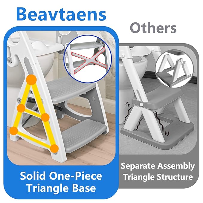 - 【Stability & Non-Slip】: Exclusive patented large triangle structure is more stable,which perfectly solves the ordinary potty seat wobble problem. It can hold up to 200 pounds/90 kg, kids of any age can use it, adults of normal weight can also use it as a step stool. There are non-slip rubber on four feet and seat ring bottom to prevent sliding