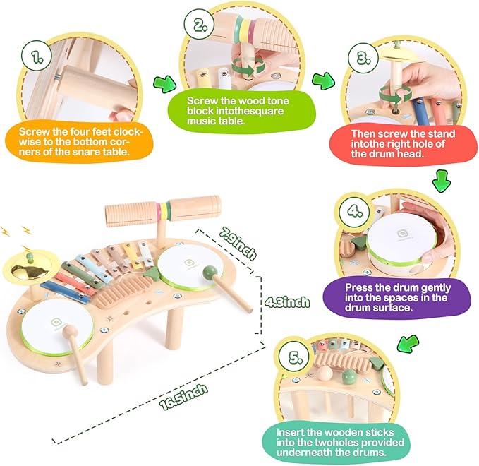 - 【7 IN 1 KIDS DRUM】Toddler drum set not only enhances your child's interest in music and strengthens your baby's eye-hand coordination, but also develops fine motor skills and sense of hearing, which consists of a moon-shaped music table, a xylophone, 2 wooden sticks, 2 drums, a Cymbal, a Cymbal stand, 4 Drum legs, and a scratch music consists of
