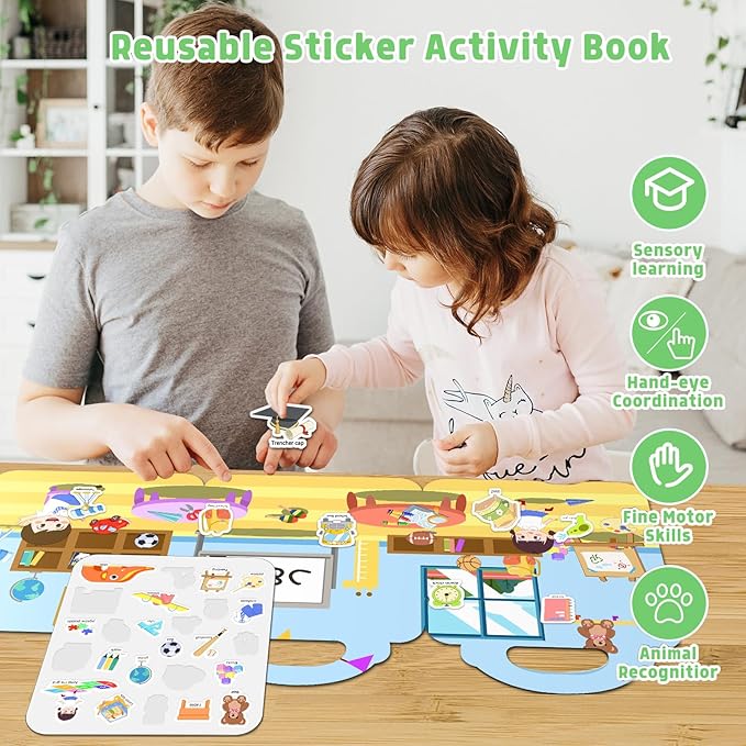 JOFREY at School Reusable Sticker Book,Jelly Sticker for Kids,50pcs Stickers ,Quiet Busy Book Preschool Learning Activities for Toddlers Ages 3-6