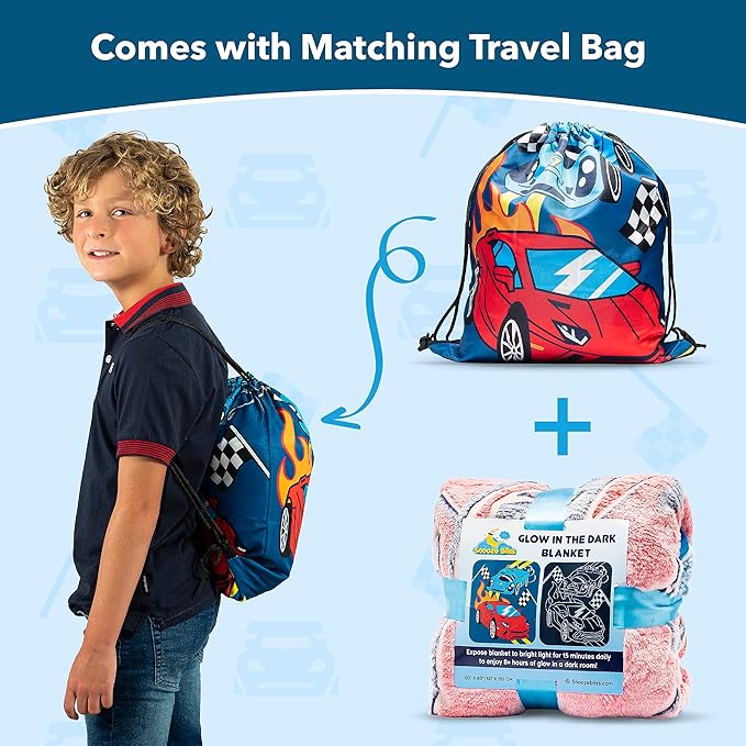 - 🏎️ THE ULTIMATE GLOW IN THE DARK RACE CAR BLANKET – As night falls, this glow in the dark blanket will turn any room into a high-speed adventure! Featuring glowing race cars, fiery flames, and checkered flags, it’s the perfect gifts for boys who love racing, speed, and cozy comfort.
