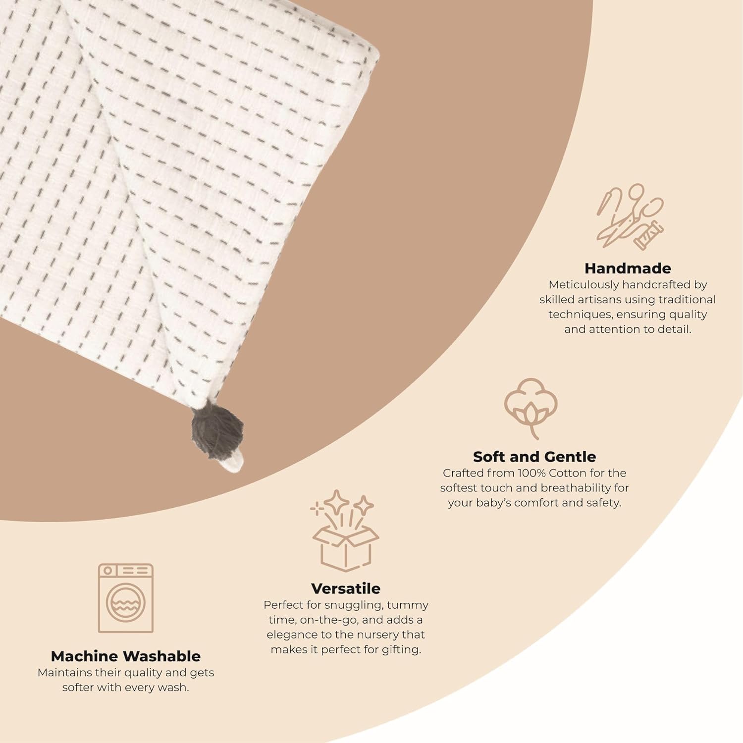 - Hand Stitched - Meticulously crafted with expert hand-stitching, each baby blanket showcases a stunning design that embodies both artistry and attention to detail, making it a cherished heirloom piece for your little one