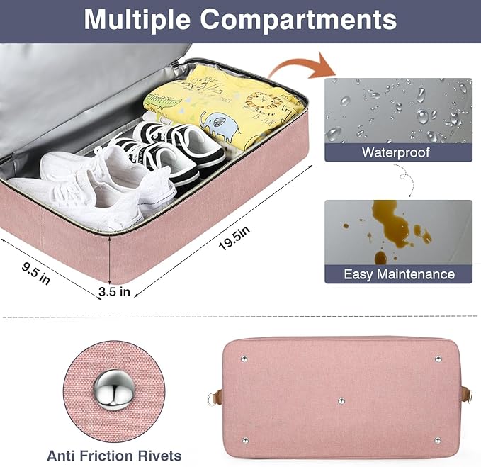 - [Dry Wet Seperated Compartment] The compartment of this travel diaper bag is fashioned with PVC waterproof materials.This compartment can also be used to hold dirty clothes, shoes or wet towels, separating wet and dry to prevent your clean luggage from getting soiled or wet. Compartment size: 19.5*9.5*3.5in. Also studded 4 round metal feet in the bottom to keep the baby diaper bag clean and off the ground.