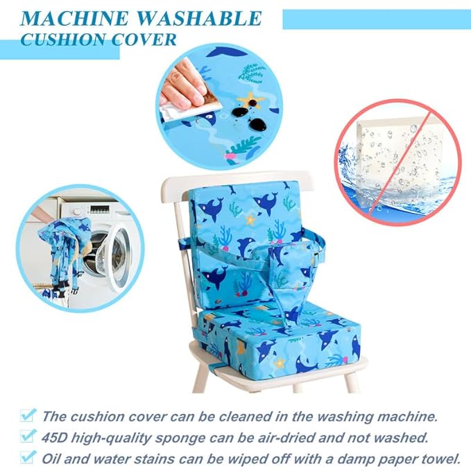 - [Easy to clean] Our toddler booster seat for table is made of high-quality waterproof fabric, which is easy to clean, so if food spills, you can use a wet towel to wipe it clean. In addition, the toddler booster seat for table has a leather zipper design, which is detachable and won't hurt hands