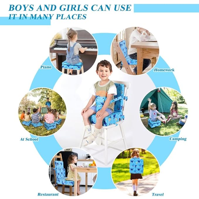 - [Perfect size] The portable booster seat has a backrest size of 14.1 x 12.6 x 1.57 inches and a cushion size of 14.1 x 12.6 x 4 inches, making our kids booster seat suitable for most dining chairs. We have also increased the length of the bottom seat belt to better secure the seat cushion to the chair. Note: Due to packaging compression, the product will return to its original height within 24-48 hours after opening