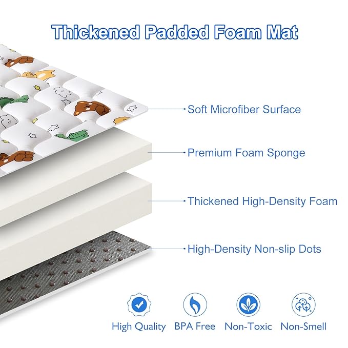 - Safety and Non-slip: The non-slip design on the bottom of the baby play mat ensures stability and safety during playtime, providing a safe place for your kids to romp around. Our floor playmates meets US CPC certification and regulations and passes phthalate, lead, and toxicity tests. So you can trust that our product is safe for your little one