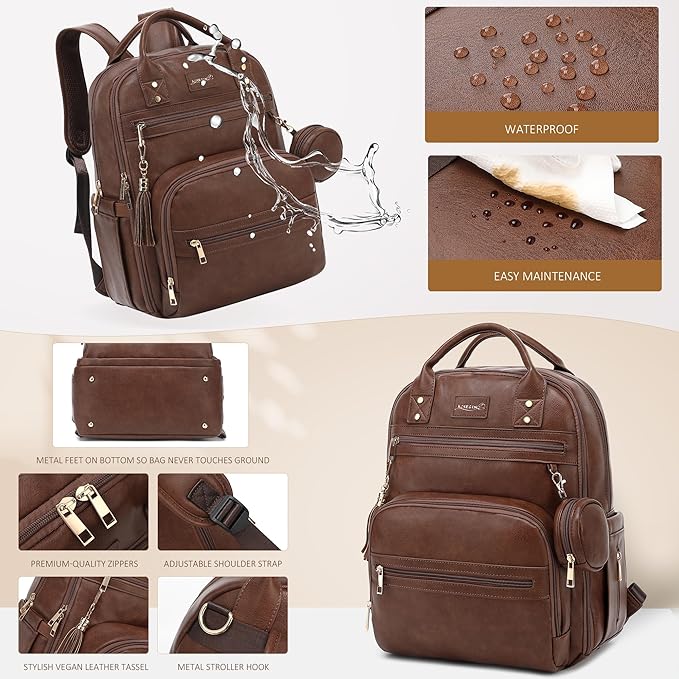 Premium Vegan Leather Diaper Bag Backpack with Waterproof Changing Pad, Reinforced Zippers & Odor-Free,20 Pockets Pro Organizer, Fits 15.6" Laptop, Stroller Straps, Baby Bag for Mom,Dark Brown