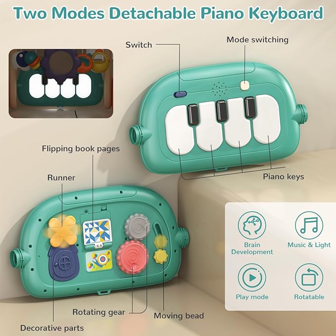 - Interchangeable Piano and Rattle Toy: The double-sided piano plate with soft lighting and great music can be swapped with the detachable rattle toy, while the angle of the plate can be adjusted by turning the bottom button. The unique detailed design allows your baby to kick, scratch, bite and explore multiple play methods, igniting their curiosity and imagination