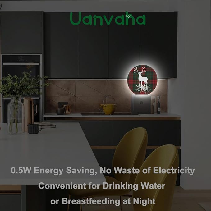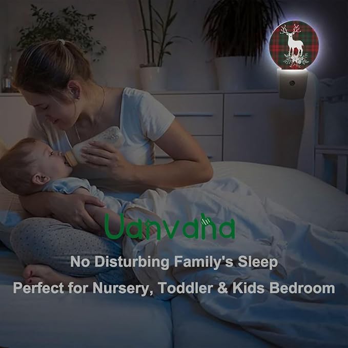 Tartan Checkered Plaid Nightlights Plug-in Reindeer with Christmas Bouquet Floral, Red Green Night Light Auto Dusk-to-Dawn Sensor Lamp for Boys Girls Bedroom Playroom, LEDLAMP3027