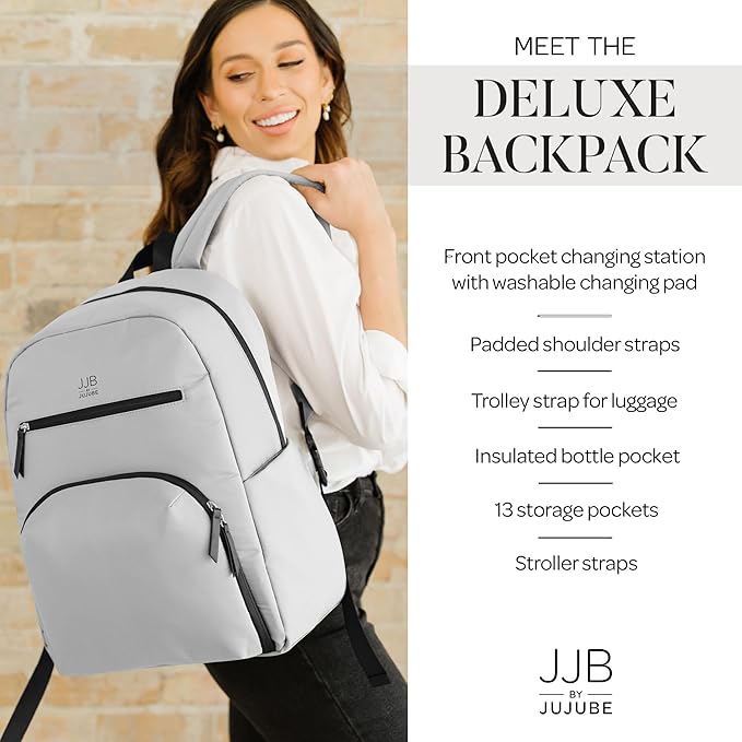 JJB by JuJuBe - New Deluxe Diaper Bag Backpack with Portable Changing Pad, Stroller Straps, Large Travel Backpack for Boy or Girl, Carrying Baby Bottles, Diapers, Pacifiers, Grey, Mother's Day Gift