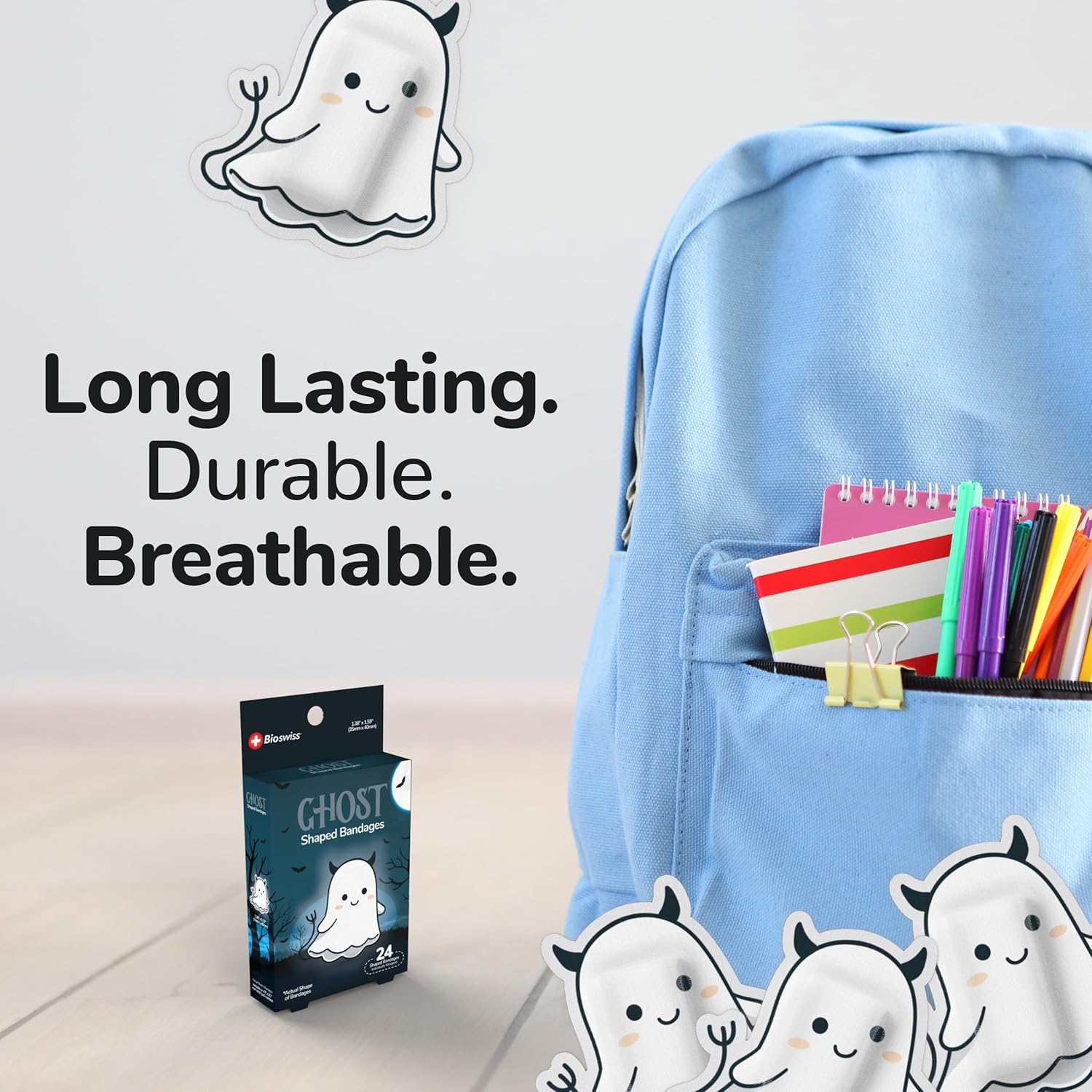 BioSwiss Bandages, Halloween Ghost Shaped Self Adhesive Bandage, Latex Free Sterile Wound Care, Fun First Aid Kit Supplies for Kids, 24 Count