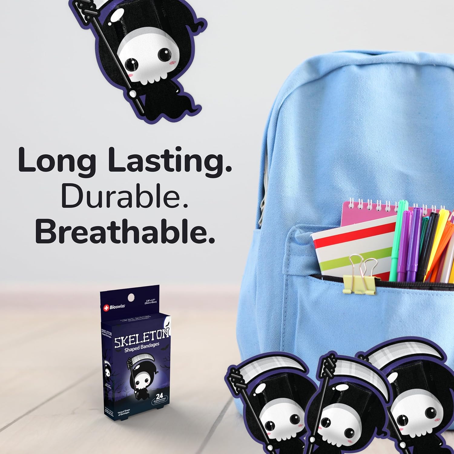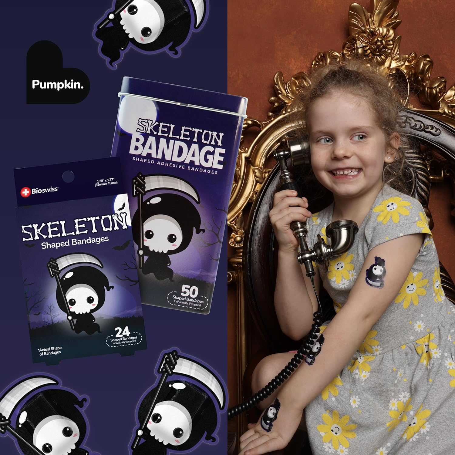 - SKELETON HALLOWEEN BANDAGES: This 24 piece pack of frightfully fun Halloween Skeleton bandages is great for putting a smile on kids' faces while protecting wounds such as cuts, scrapes, and burns; sticky bandages are perfect for kids and adults alike, and also for school nurses and pediatric doctors
