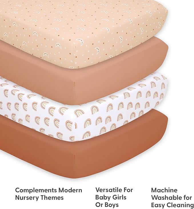 - Boho Sheets: This rustic rainbows to relaxing celestial prints paired with neutral solids, each sheet is a delightful tapestry of captivating patterns 4 pack crib sheet set in palette of warm earth tones; dusty coral, peach and tawny brown is the optimal start for your baby girl or boy.