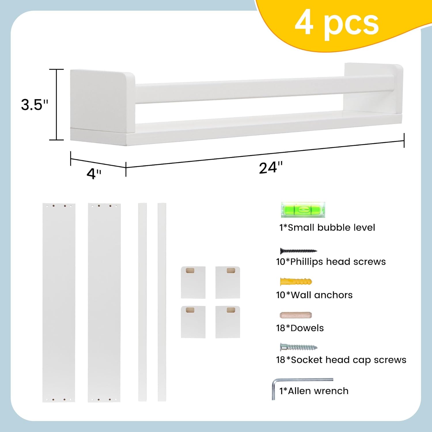 Fun Memories Nursery Book Shelves - Rustic Natural Solid Wood Floating Bookshelf for Kids - Wall Book Shelves for Kids Room (White, 24inch - 4P)