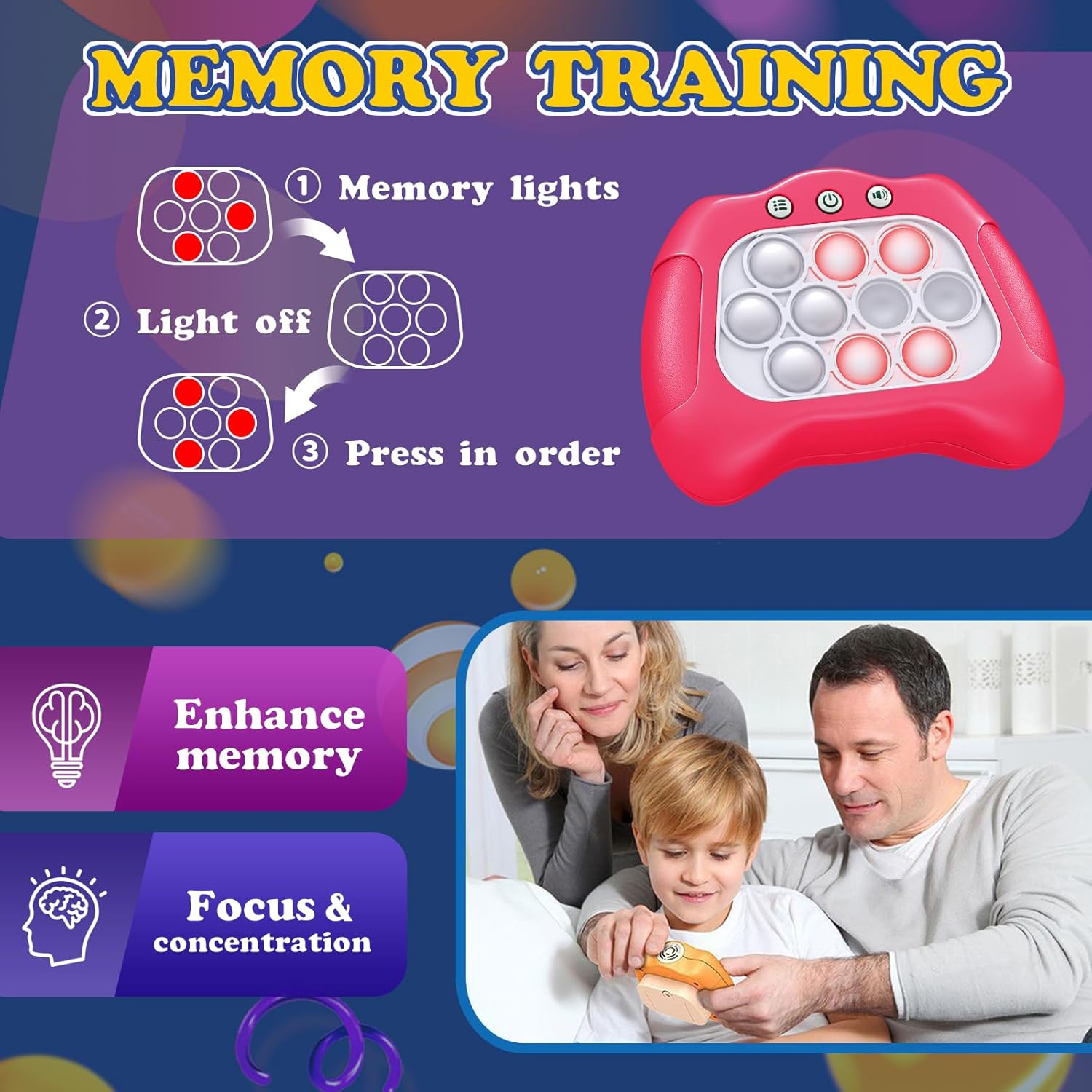 - 【Upgraded Quick Push Pop Game】-- If you are looking for an entertaining way to pass times for kids, check out our pop pro light up games. Compare to addictive classic press bubble game handheld, our fast push bubble games make kids engaged in positive thinking, hand-eye coordination, and brain training during playing challenges filled with lights and sounds, promoting kid’s sensory development, improving reaction ability, memory, and logical thinking skills in a fun way.