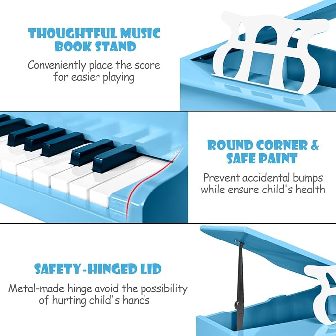 - 【Perfect Educational Toy】The mini grand piano comes with a comfortable stool for kids to sit, thus they can play with more coziness. Also, designed with a functional music stand, kids can learn to play the piano with higher efficiency.