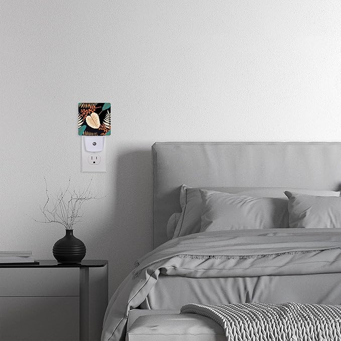 Tropical Leaves Night Light - Plug into Wall, Blue Orange and Black Flowers Night Light with Dusk to Dawn Sensor for Room Decor, Hallway, Kitchen, Bathroom