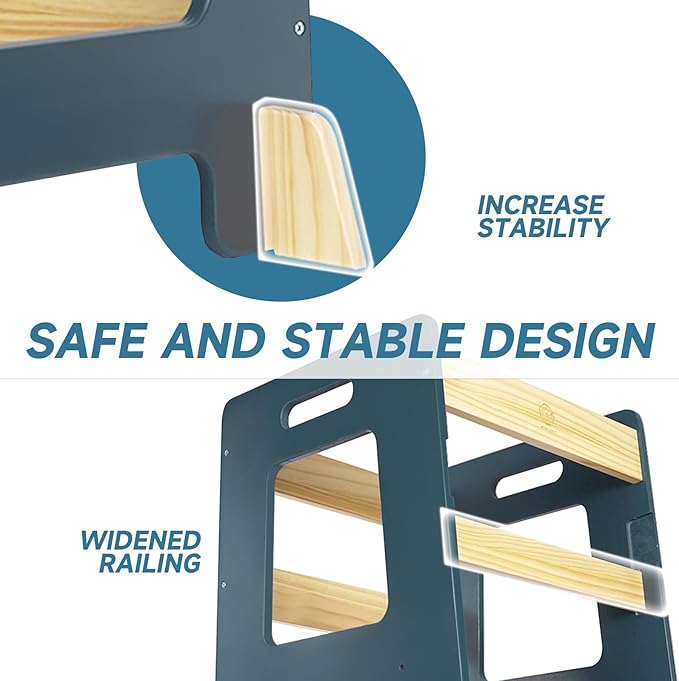 WOOD CITY Kitchen Step Stool - Safe Montessori Standing Tower for Kids with Safety Rail, Height Adjustable Toddler Ideal Helper for Learning New Skills, Anti-Slip Protection for Bathroom - Deep Blue