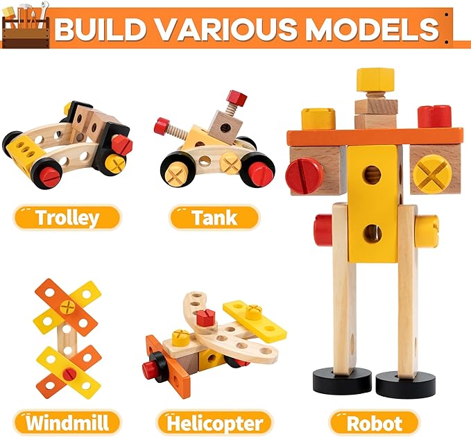 - 🎁【PERFECT GIFT】The take-along tool kit is made of solid wood and non-toxic finishes. Smooth surface, round corners, non-sharp edges, and perfect size for little hands, these tools are totally child-friendly, making an exceptional gift for your little carpenter.